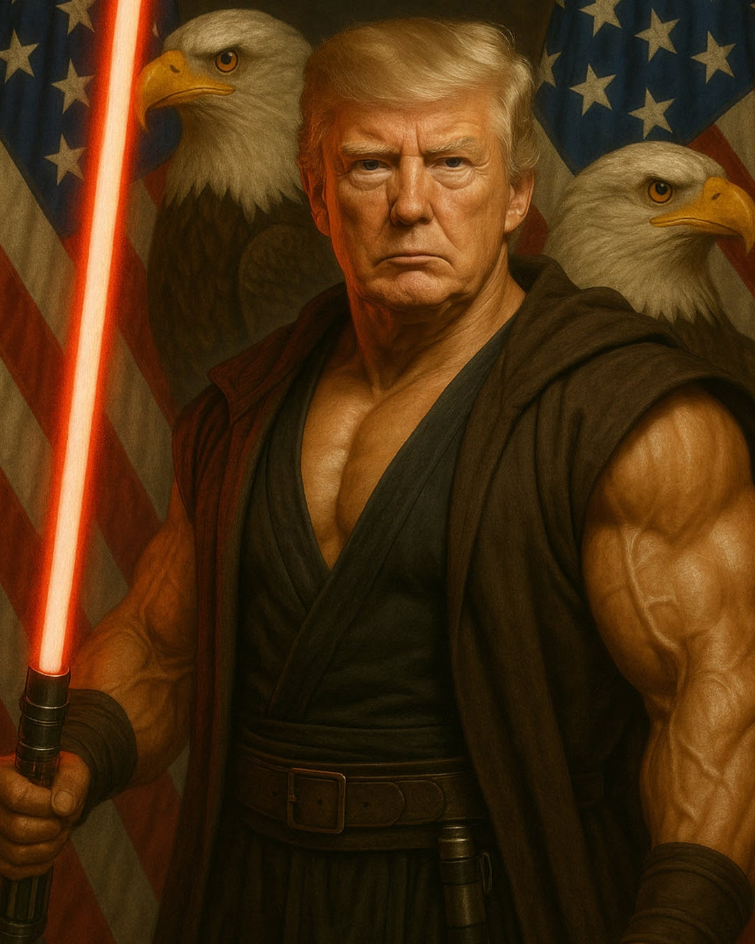 Ainda há imagens de um Trump maromba com duas águias e a bandeira dos Estados Unidos ao fundo (ah e segurando um sabre de luz do Star Wars ???); políticos democratas com sombreiros comendo comida mexicana; um pinguim segurando uma bandeira dos EUA e caminhando ao lado de Trump na Groenlândia; e até o Trump vestido como Papa. Isso é muito surreal.